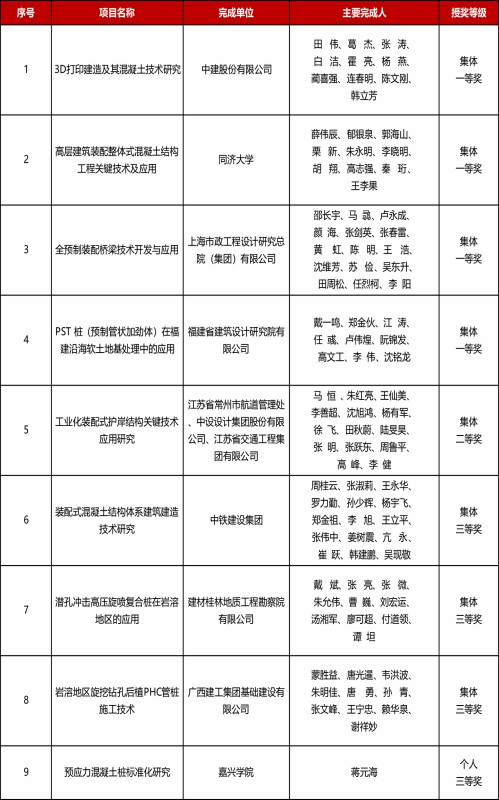 2018年度“建華工程獎”獲獎項目