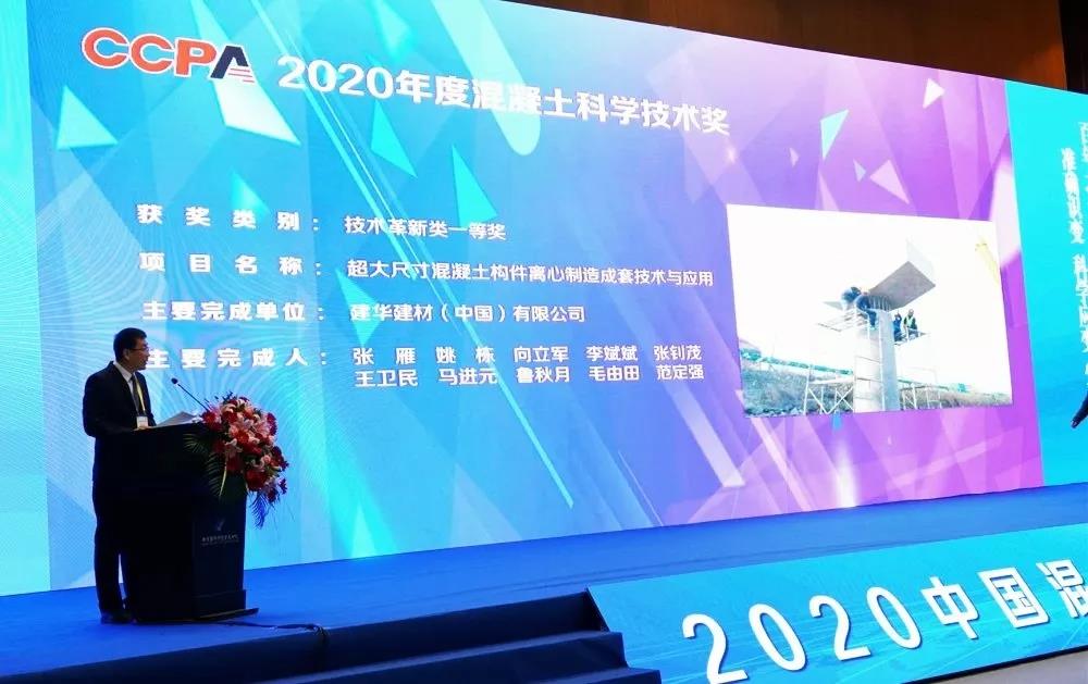在2020年度混凝土科學技術獎項中,建華建材集團申報的《系列化高性能預制樁成套關鍵技術研發與應用》榮獲科技進步類唯一一個一等獎,《超大尺寸混凝土構件離心制造成套技術與應用》榮獲技術革新類唯一一個一等獎。