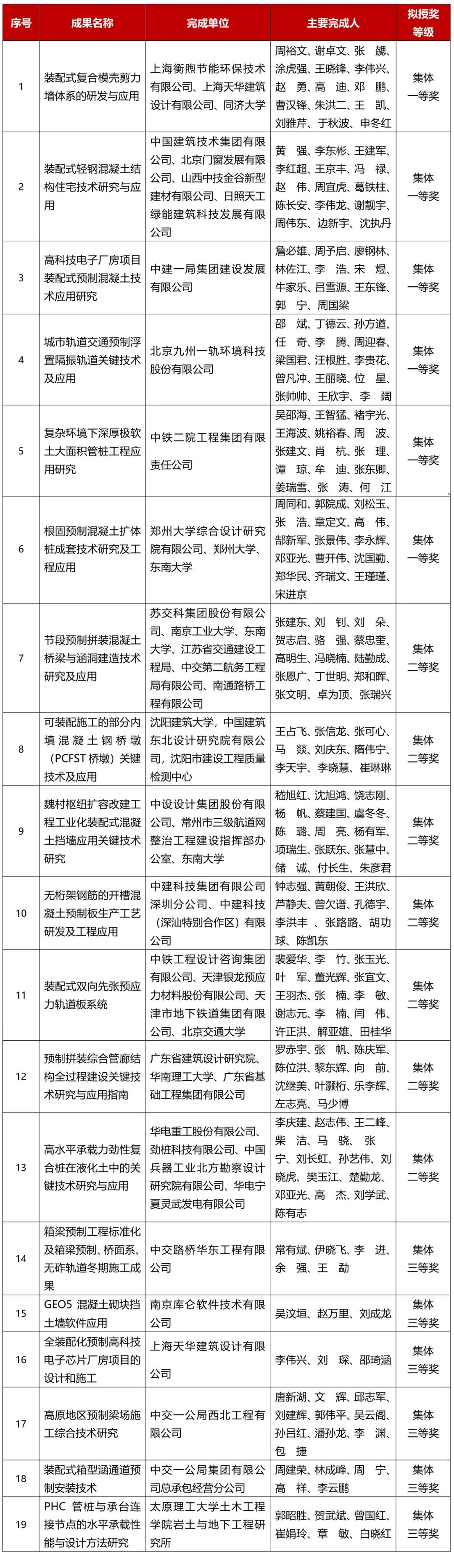2021年度“建華工程獎”共收到有效申報材料68份,根據《“建華工程獎”章程》的要求,經過形式審查、預審、專家評審等程序,擬授予“裝配式復合模殼剪力墻體系的研發與應用”等6項成果集體一等獎、“節段預制拼裝混凝土橋梁與涵洞建造技術研究及應用”等7項成果集體二等獎、“箱梁預制工程標準化及箱梁預制、橋面系、無砟軌道冬期施工成果”等6項成果集體三等獎。為了確?!肮_、公正、公平”的原則,現將擬授獎名單予以公示。如有異議,請在公示期內,書面向“建華工程獎”獎勵辦公室提出。以單位名義的,應寫明單位、聯系人、聯系電話,并加蓋單位公章;以個人名義的,應署本人真實姓名、工作單位和聯系電話。