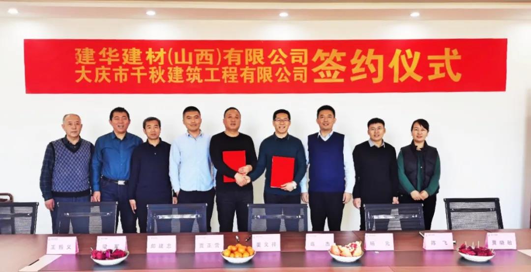 近日,建華建材(山西)有限公司與大慶市千秋建筑工程有限公司(以下簡稱千秋建筑)就萬秋新型建材有限公司股權轉讓合作事宜舉行了簽約儀式。