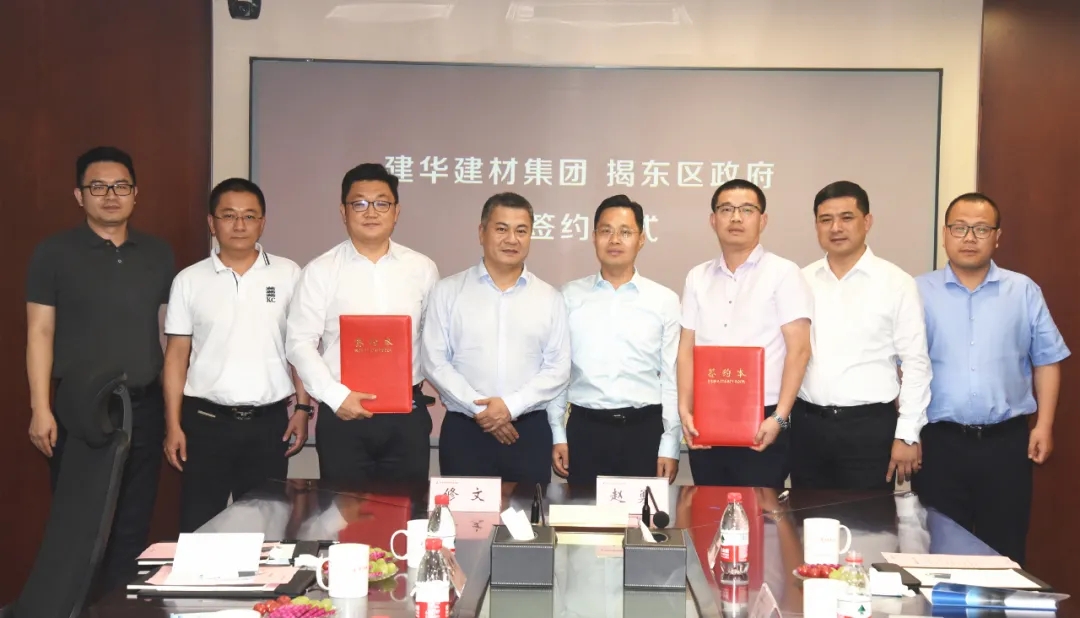 5月25日,建華建材集團與揭陽市揭東區人民政府舉行裝配式建筑產業基地項目簽約儀式。揭東區委書記方烽,區委副書記修文,市招商引資辦副主任、中德金屬生態城黨工委書記、管委會主任林仲龍;建華建材集團董事長王剛、總裁助理兼投資發展辦主任汪峰、惠州建華副總經理趙勇、礦產事業部副總經理石柏峰等領導出席簽約儀式。