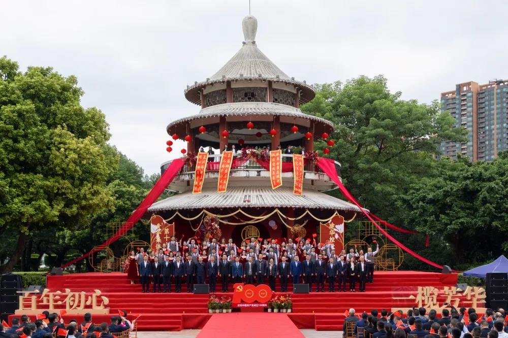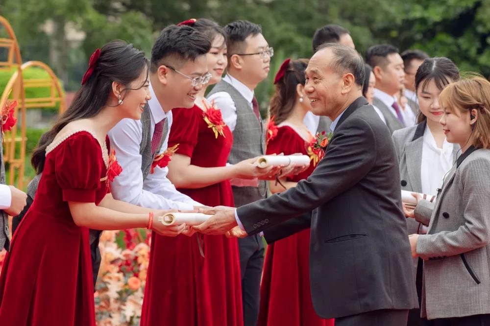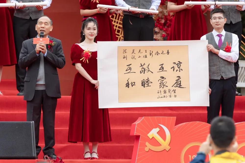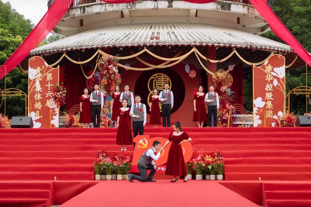 所有來賓揮舞國旗,齊聲歌唱《沒有共產黨就沒有新中國》,把現場的氣氛推向高潮。伴著紅心向黨的告白,“百年初心,一‘欖’芳華”第十六屆青年集體婚禮外場圓滿禮成!